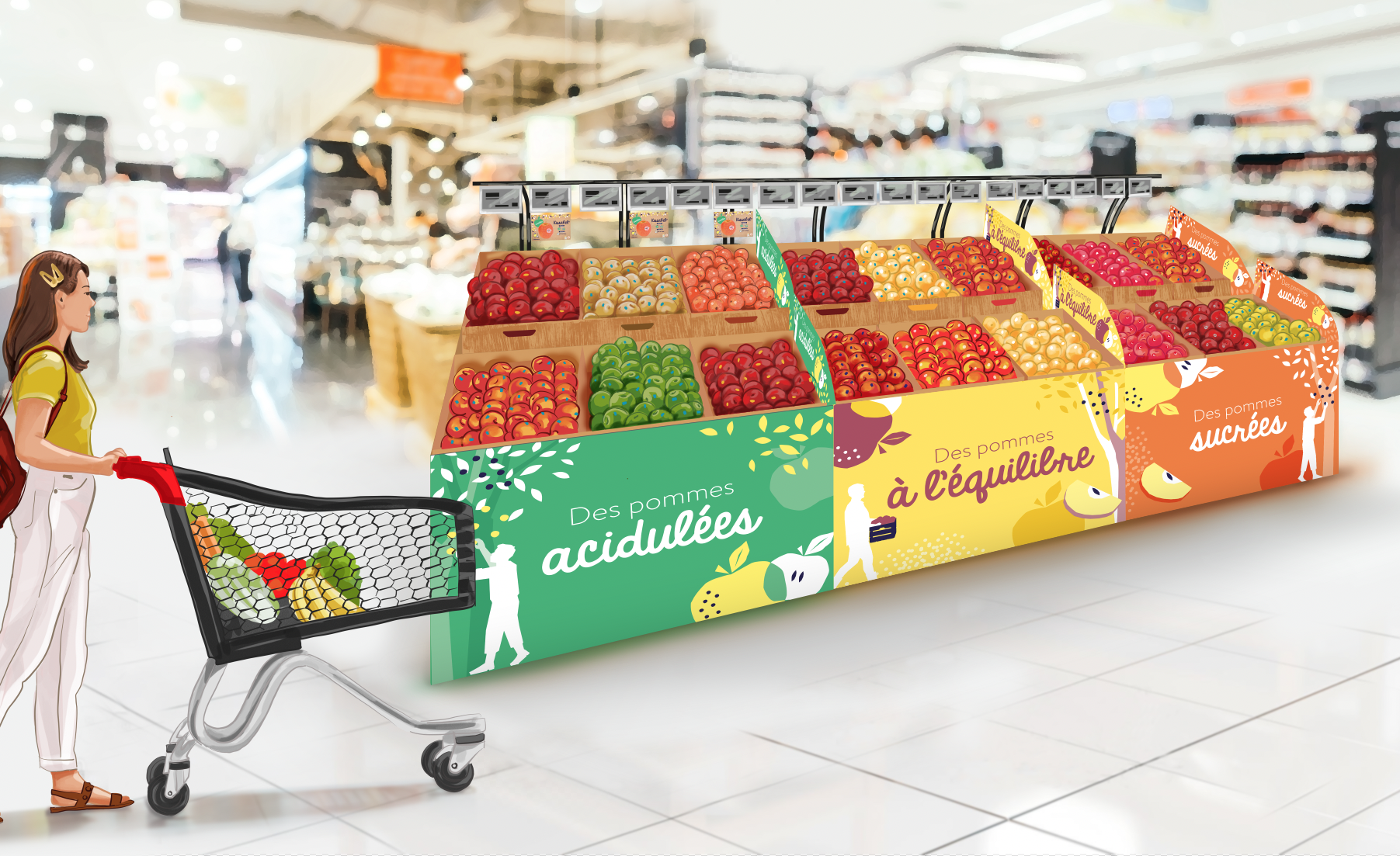Conception et réalisation de l’identité de segmentation des variétés de pommes. Réalisation des jupes palettes, panonceaux, séparateurs rayons sur cette base de ligne graphique Réalisation du rough couleur du dispositif magasin