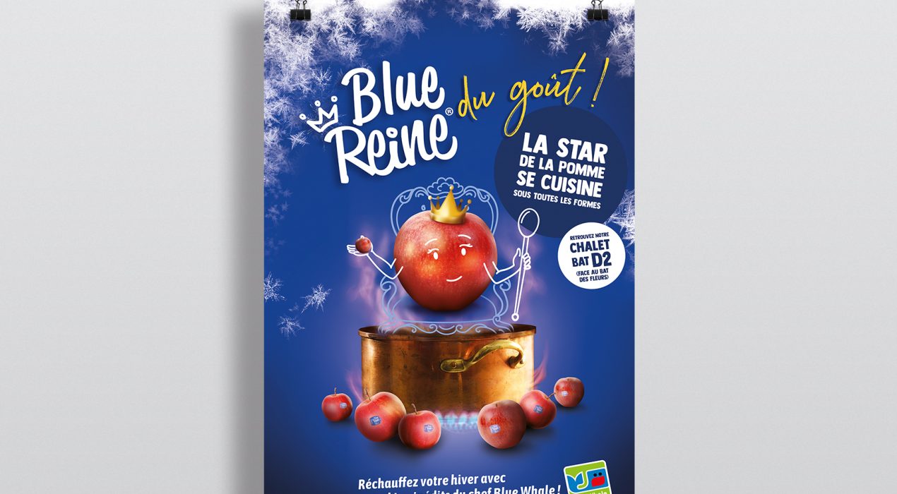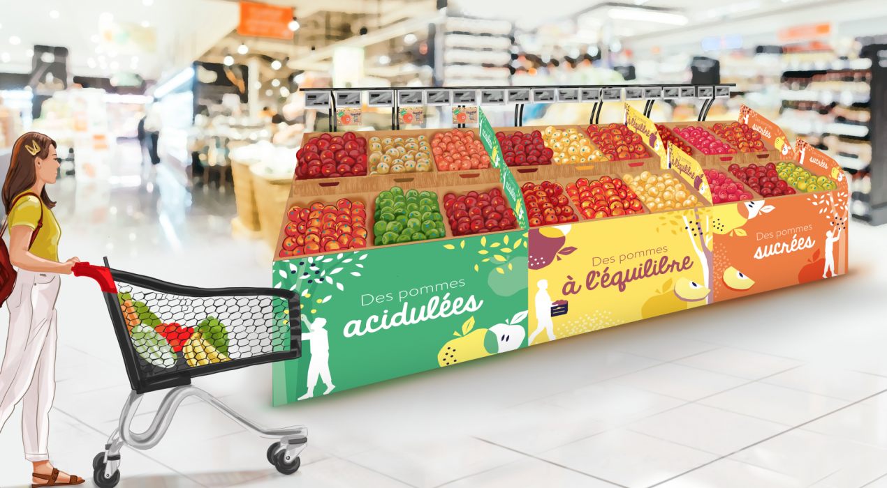 Conception et réalisation de l’identité de segmentation des variétés de pommes. Réalisation des jupes palettes, panonceaux, séparateurs rayons sur cette base de ligne graphique Réalisation du rough couleur du dispositif magasin