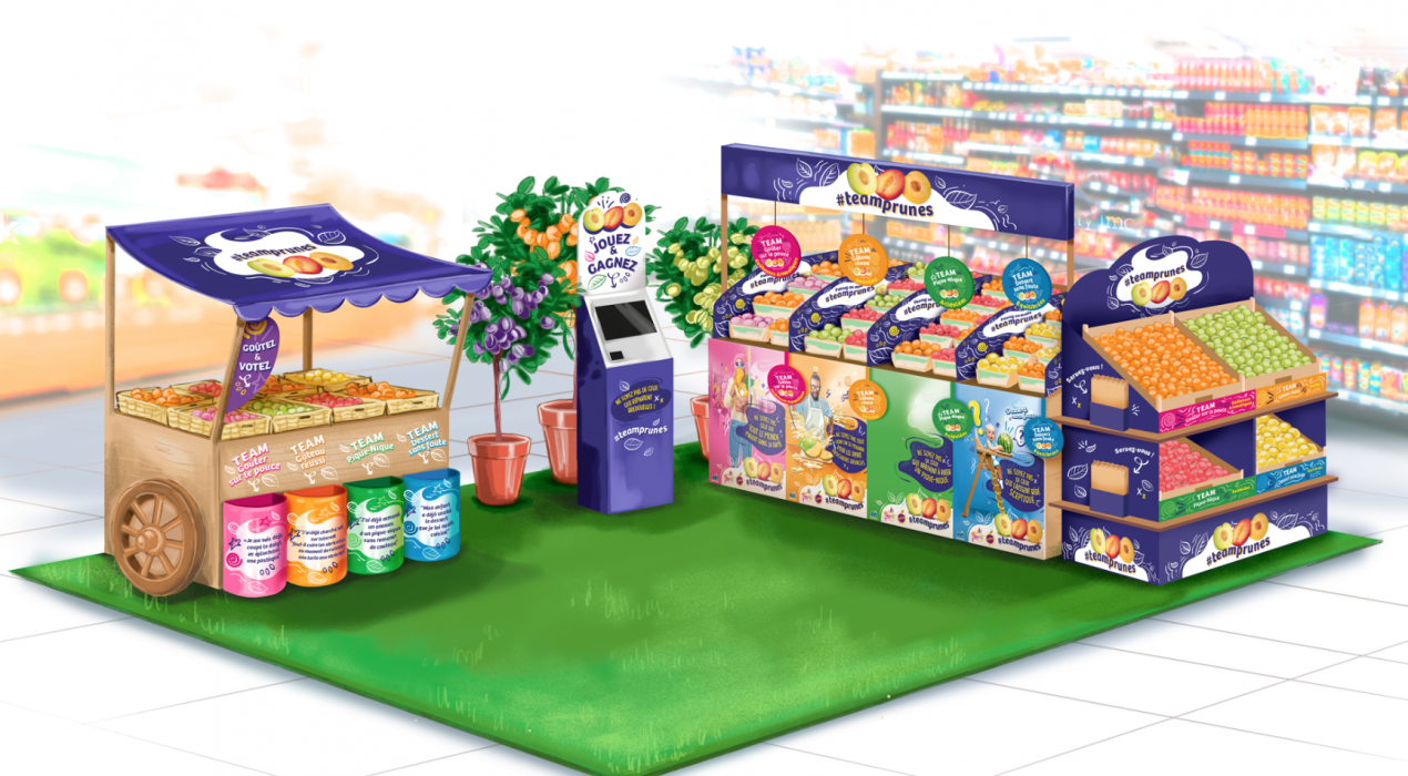 Conception et réalisation de l’identité de segmentation des variétés de prunes. Conception et réalisation des KeyVisual de campagne sous forme de saga Déclinaison des jupes palettes, panonceaux, séparateurs rayons, PLV, stop rayons, borne de jeu, etc. sur cette base de ligne graphique Réalisation du rough couleur du dispositif magasin